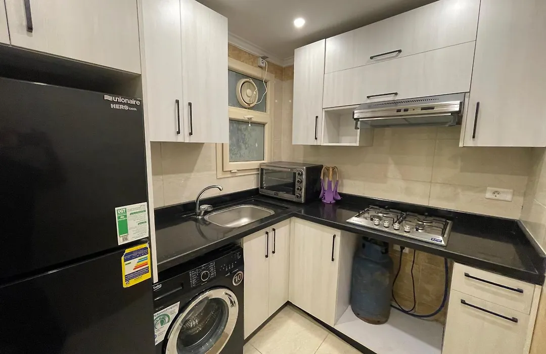 تشتمل الشقة بمساحة 120 مترًا مربعًا أيضًا على المطبخ المجهز بالكامل. وتشمل مرافق الخدمة الذاتية أيضًا ميني بار.